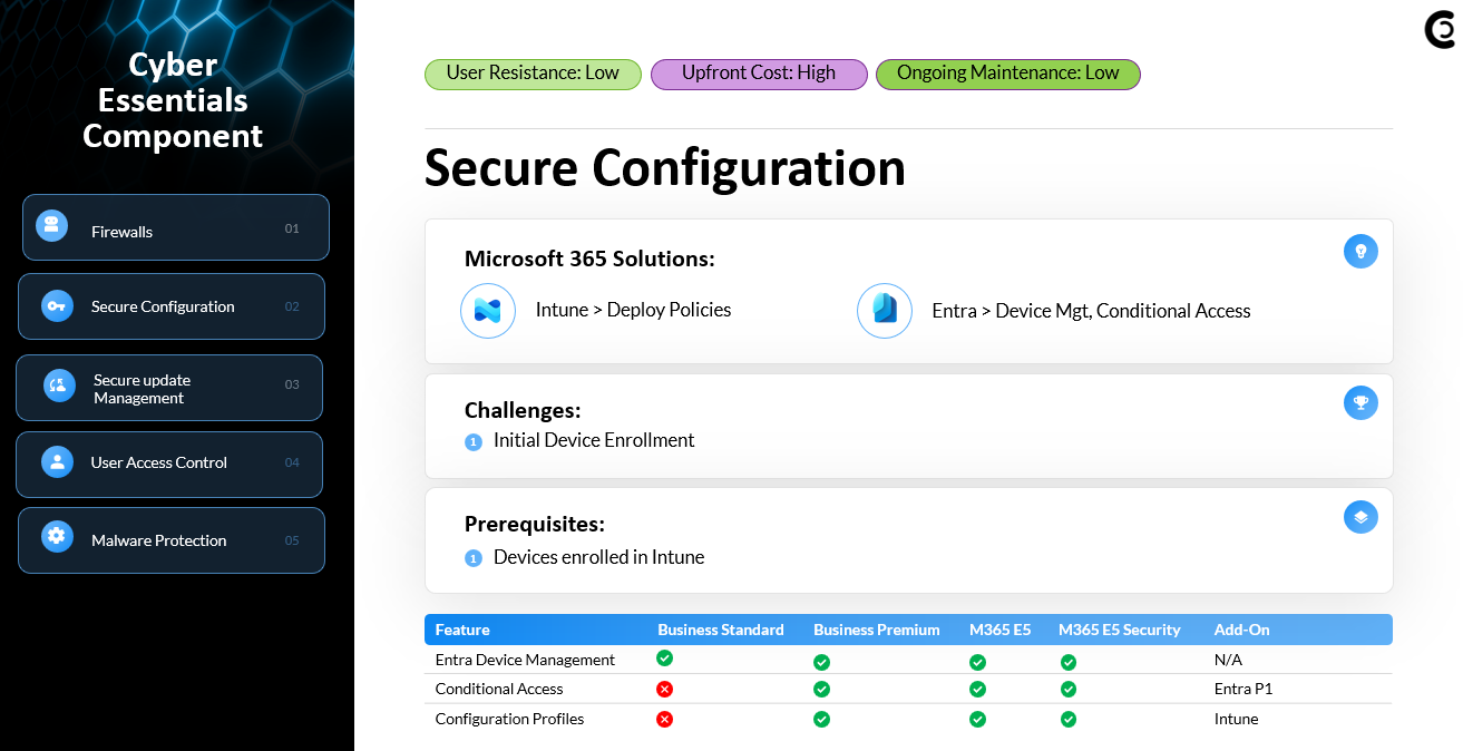 The secure configuration requirement focuses on hardening devices to prevent misuse or exploitation. Intune gives you the ability to centrally enforce settings like disabling AutoRun/AutoPlay, enforcing screen lock timers, restricting local admin privileges, configuring BitLocker, and defining secure baseline settings. Using Autopilot, you can also ensure every new device provisions with a hardened baseline—users are created as standard users, not local admins. These configuration profiles ensure every endpoint follows a consistent, secure standard aligned with Cyber Essentials expectations.