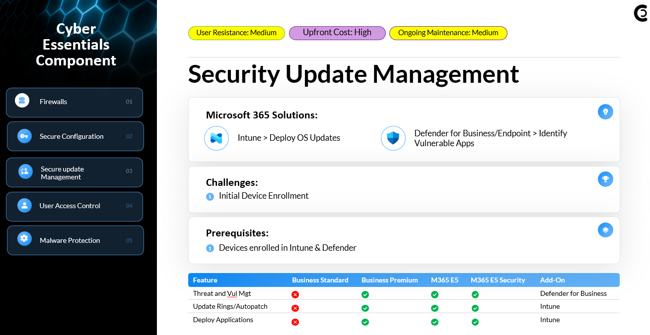 Cyber Essentials requires timely patching of operating systems and applications to reduce exposure to known vulnerabilities. In a Microsoft 365 environment, Intune update rings or Windows Autopatch ensure Windows updates are deployed on a reliable cadence. On top of OS patching, Defender for Business provides built-in vulnerability management, giving you visibility into outdated applications, exposed devices, and critical CVEs. This combination allows you to manage both OS updates and third-party application security, reducing the likelihood of a breach due to unpatched software.