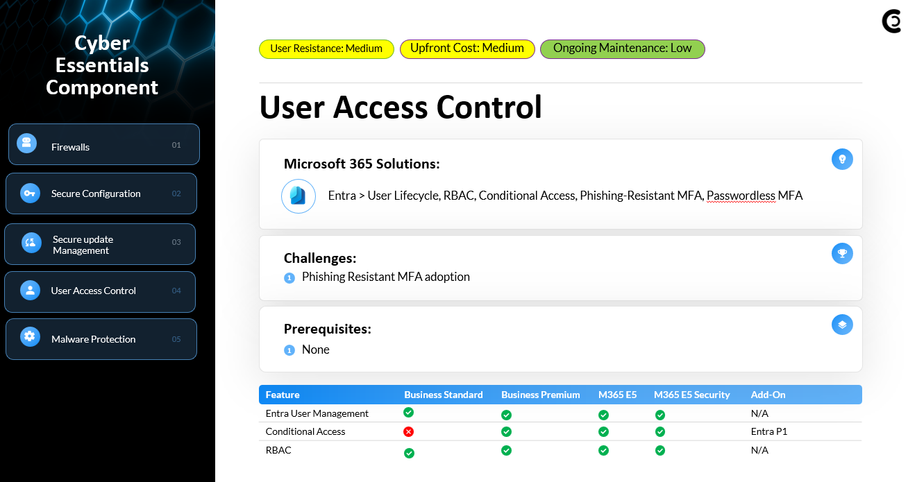 User Access Control is all about ensuring the right people have the right access at the right time. With Entra ID, you can enforce strong authentication through Conditional Access policies, including MFA, passwordless authentication, and phishing-resistant authentication strengths such as FIDO2 or passkeys. Entra also provides lifecycle management., individual user accounts (never shared accounts), onboarding/offboarding procedures, custom banned password lists, account lockout thresholds, and role-based access control for administrators. These controls ensure strong identity hygiene and reduce unauthorized access risks.