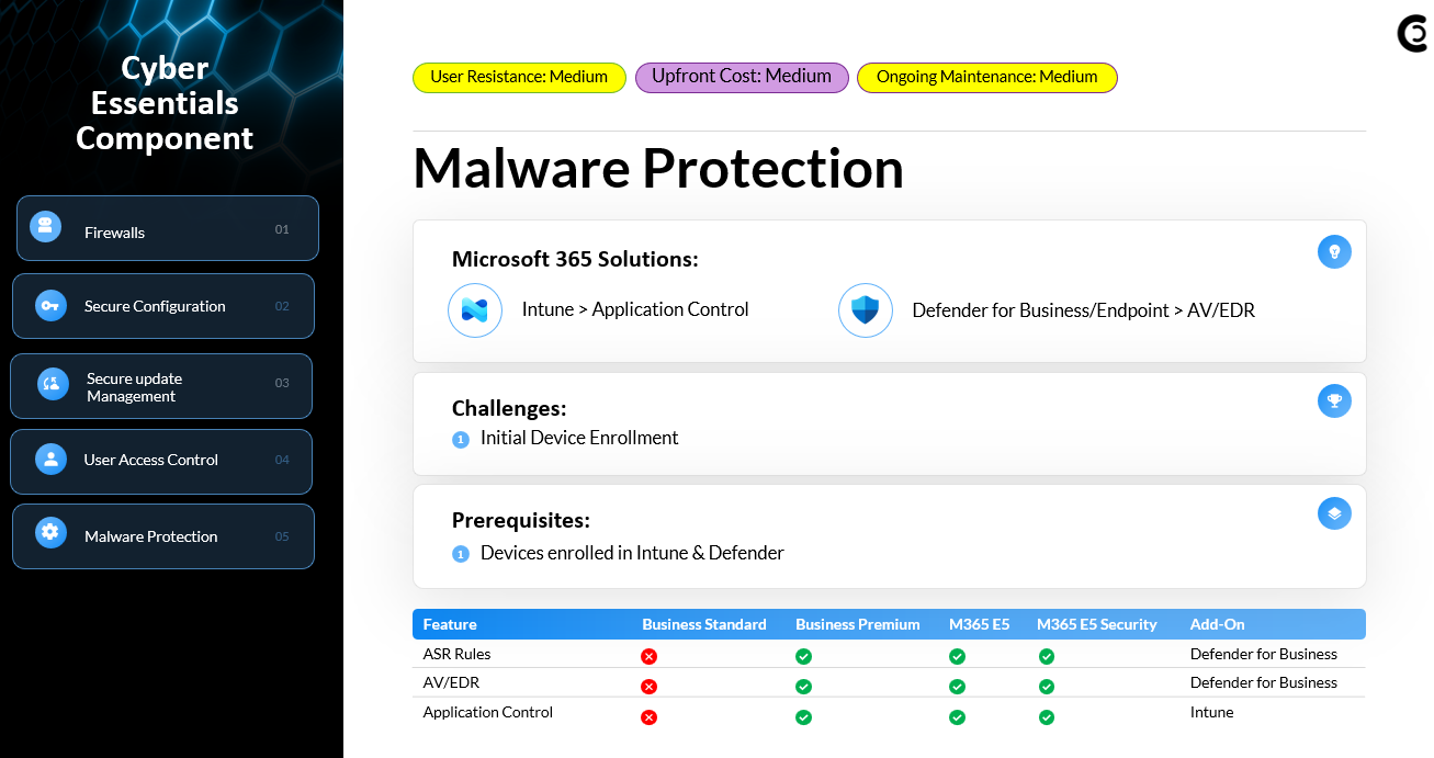 Cyber Essentials requires robust protection against viruses, ransomware, and malware. Defender for Business, bundled with Microsoft 365 Business Premium, provides enterprise-grade antivirus, endpoint detection and response, attack surface reduction rules, and Controlled Folder Access to mitigate ransomware activity. Policies are deployed seamlessly through Intune, ensuring consistent protection across all endpoints. Defender’s vulnerability management dashboard also identifies outdated or risky applications that could lead to malware infections, giving organizations a complete malware defense strategy aligned with Cyber Essentials requirements.