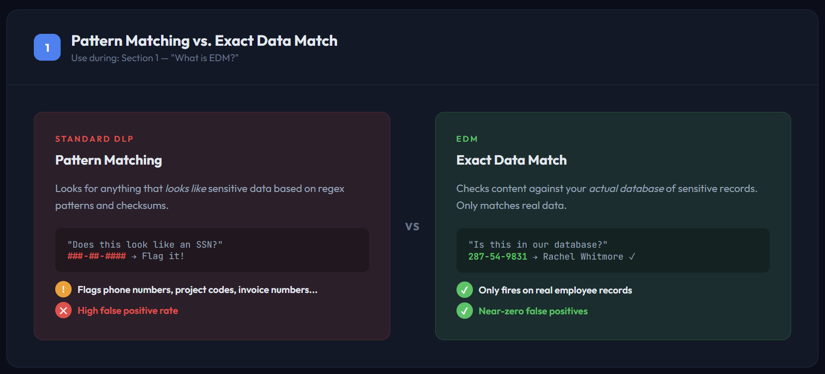 EDM matches real data, not patterns. False positives drop to near zero because DLP is checking against your actual database, not guessing based on format.