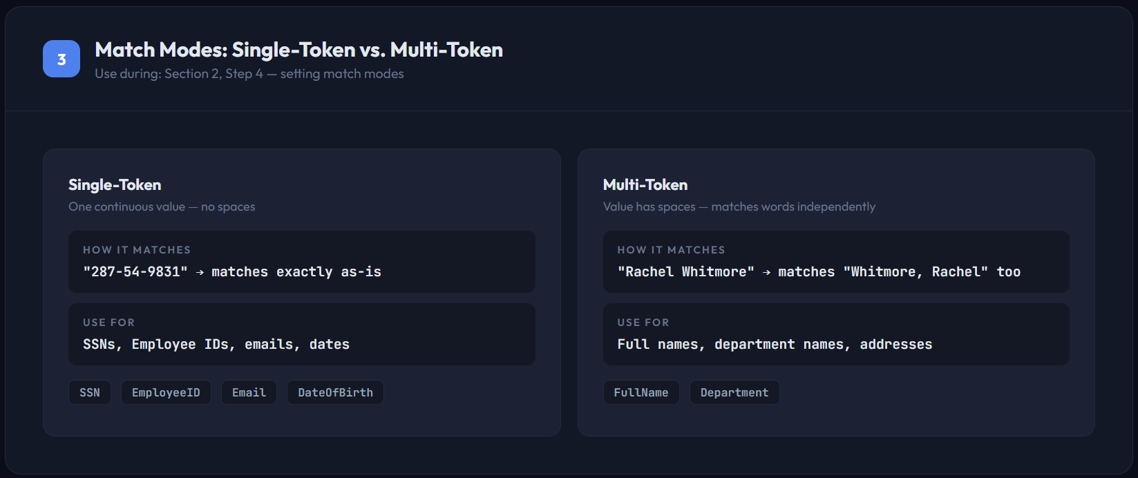 • Multi-token — for values with spaces (full names, department names). EDM matches each word independently, so “Rachel Whitmore” also catches “Whitmore, Rachel.”