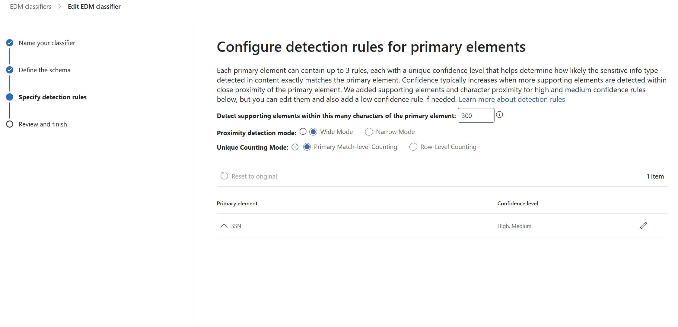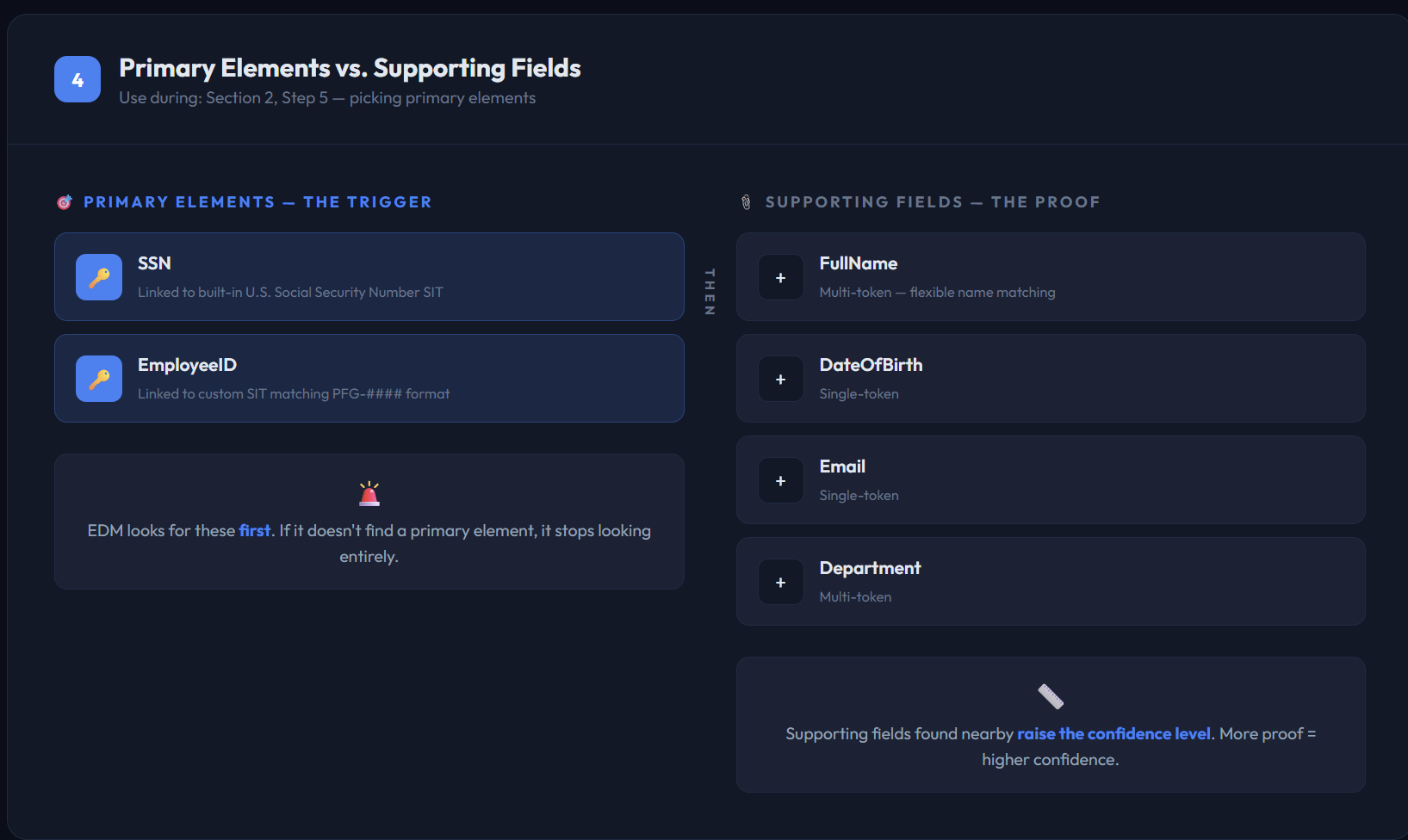 This is the most important decision. Primary elements are the fields EDM looks for first. If it doesn’t find one, it stops searching entirely. Choose fields that are both unique and likely to appear in any document containing sensitive data.