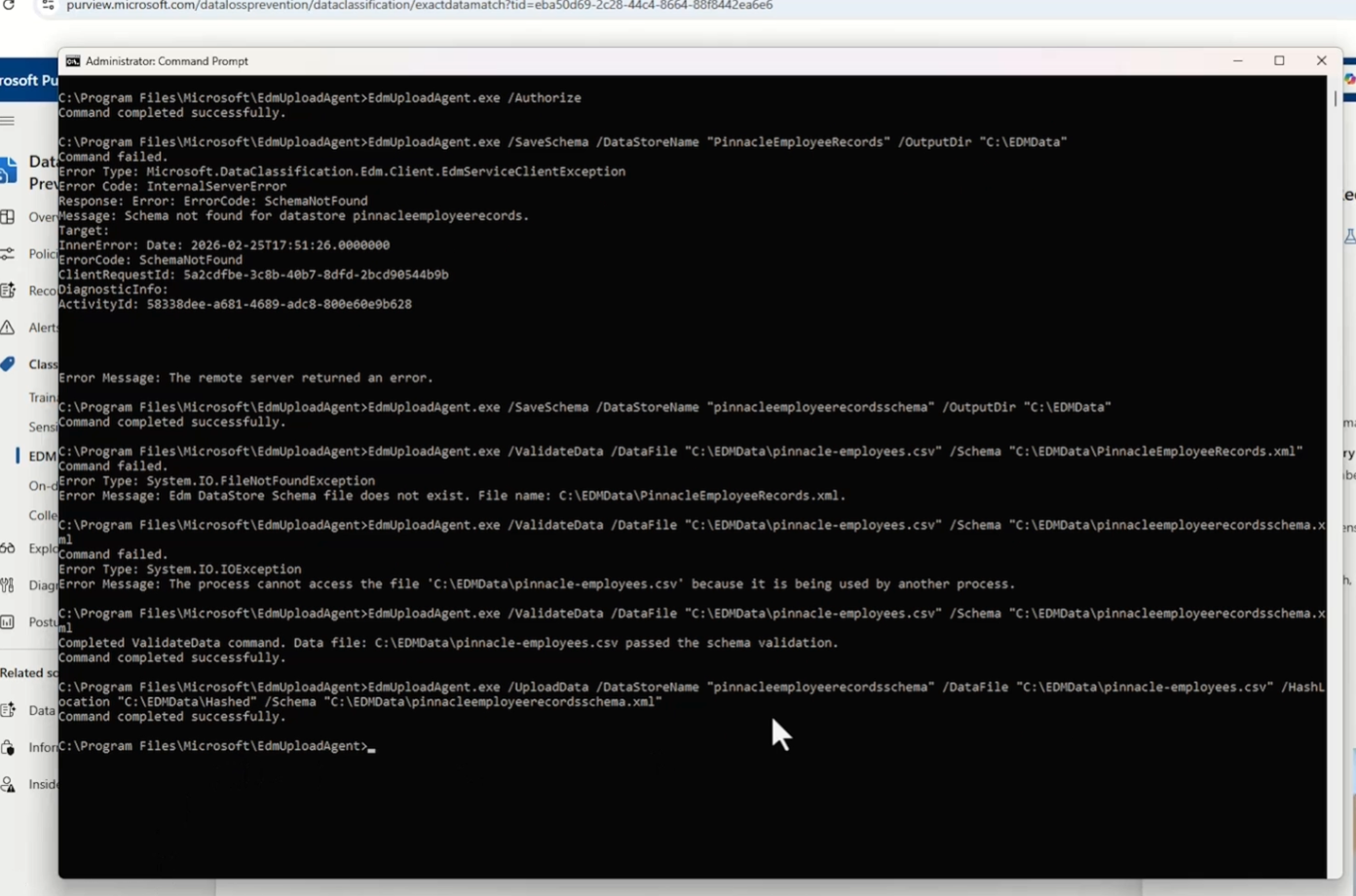 EdmUploadAgent.exe /UploadData /DataStoreName "YourSchemaName" /DataFile "C:\EDMData\employees.csv" /HashLocation "C:\EDMData\Hashed" /Schema "C:\EDMData\YourSchema.xml"