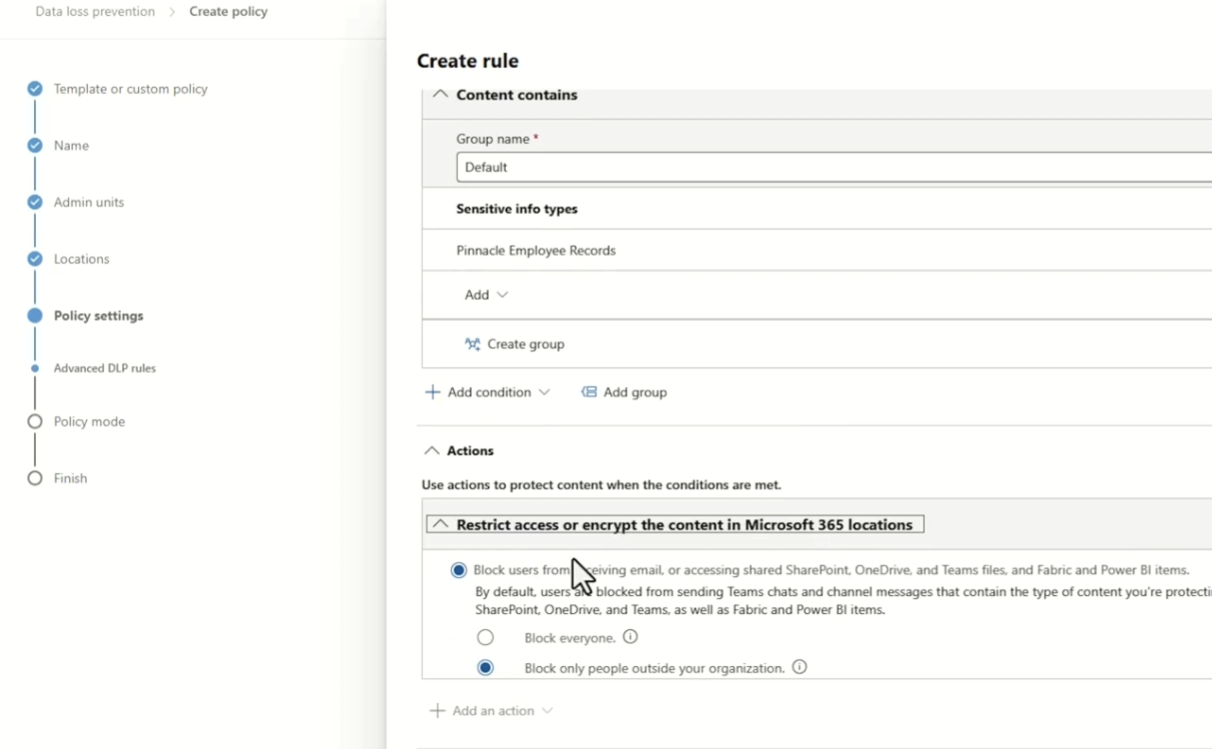 For actions, block external sharing, show a policy tip explaining why the content was blocked, and send incident alerts to your compliance team.
