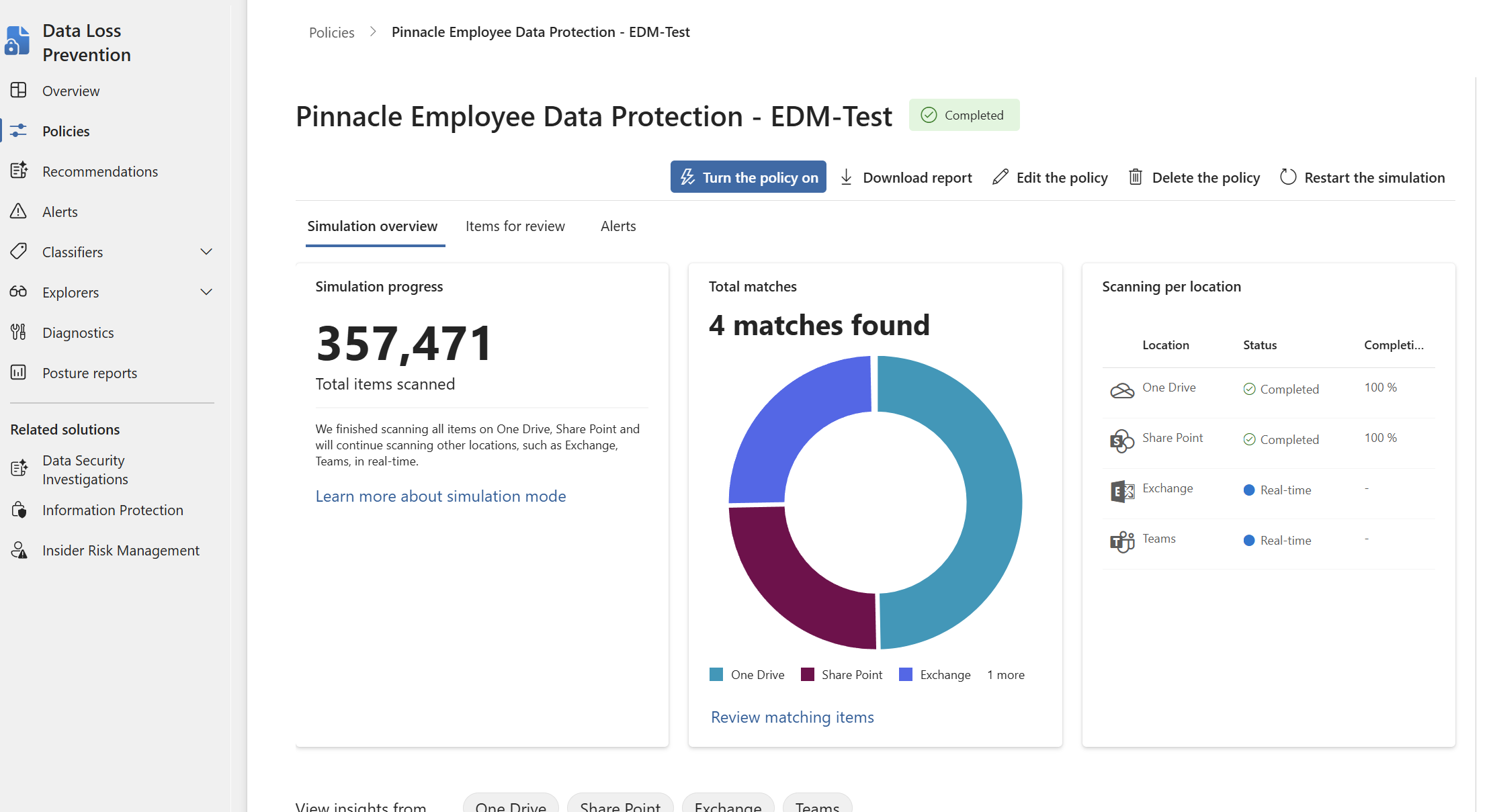 Apply it to Exchange email, SharePoint, OneDrive, and Teams. Create a rule with the condition Content contains your EDM sensitive info type at High confidence with an instance count of 1.