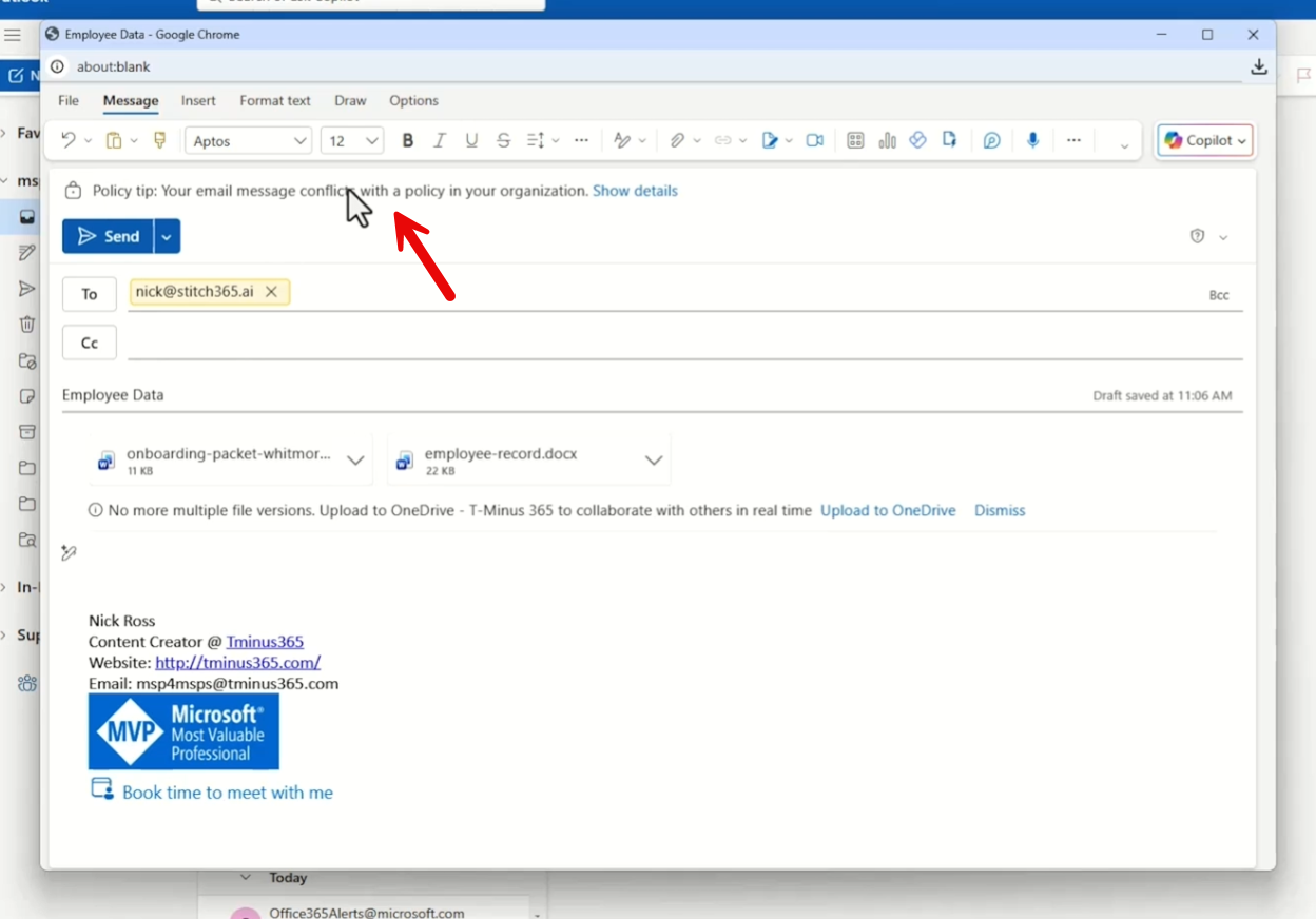An HR coordinator attaches an onboarding packet containing a real employee’s SSN, employee ID, and department to an email going to an external vendor. Blocked. Policy tip tells her why.