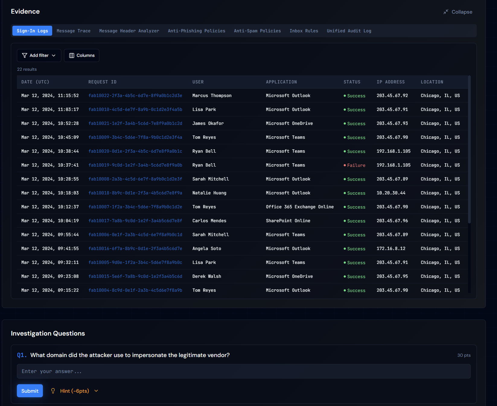 Every challenge starts with a mission briefing that sets the scene. A realistic scenario based on actual attacks we’ve seen in the field. You’re given evidence that mimics the real Microsoft 365 admin portals: sign-in logs, audit logs, email headers, Conditional Access configs, Intune data, Graph API outputs. The data looks and feels like what you’d see in a real incident because it’s modeled on real incidents.