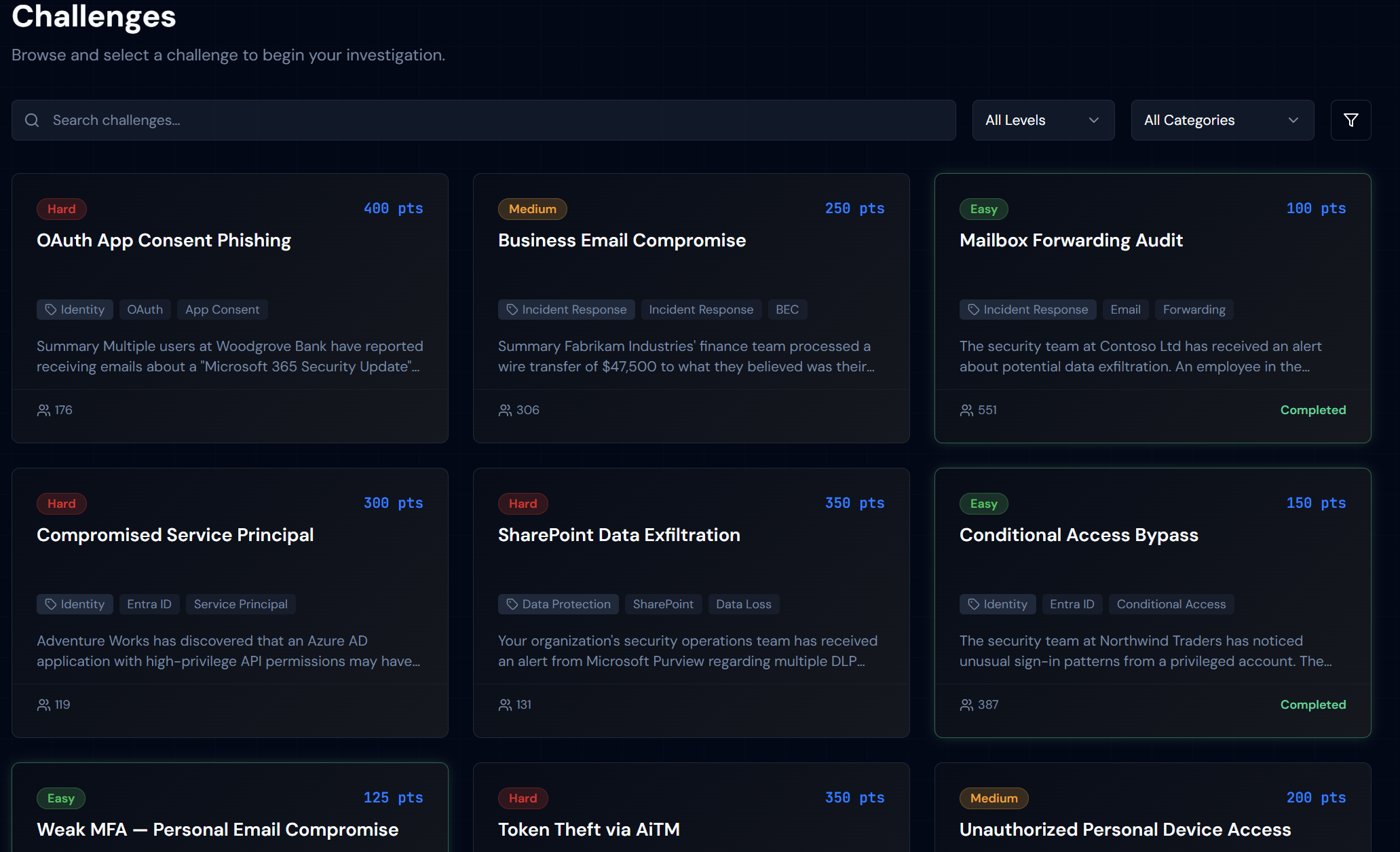 Challenges range in difficulty from beginner, reading sign-in logs for the first time, to advanced scenarios involving full tenant compromises across identity, email, data, and devices. Whether you’re a Level 1 tech or a senior security engineer, there’s something that’ll push you.