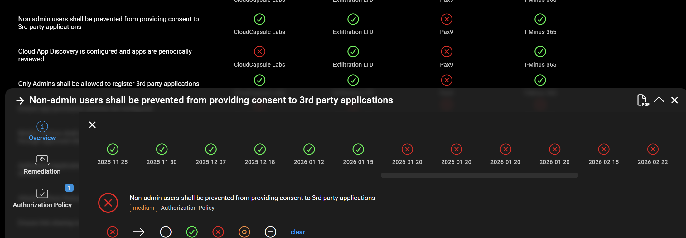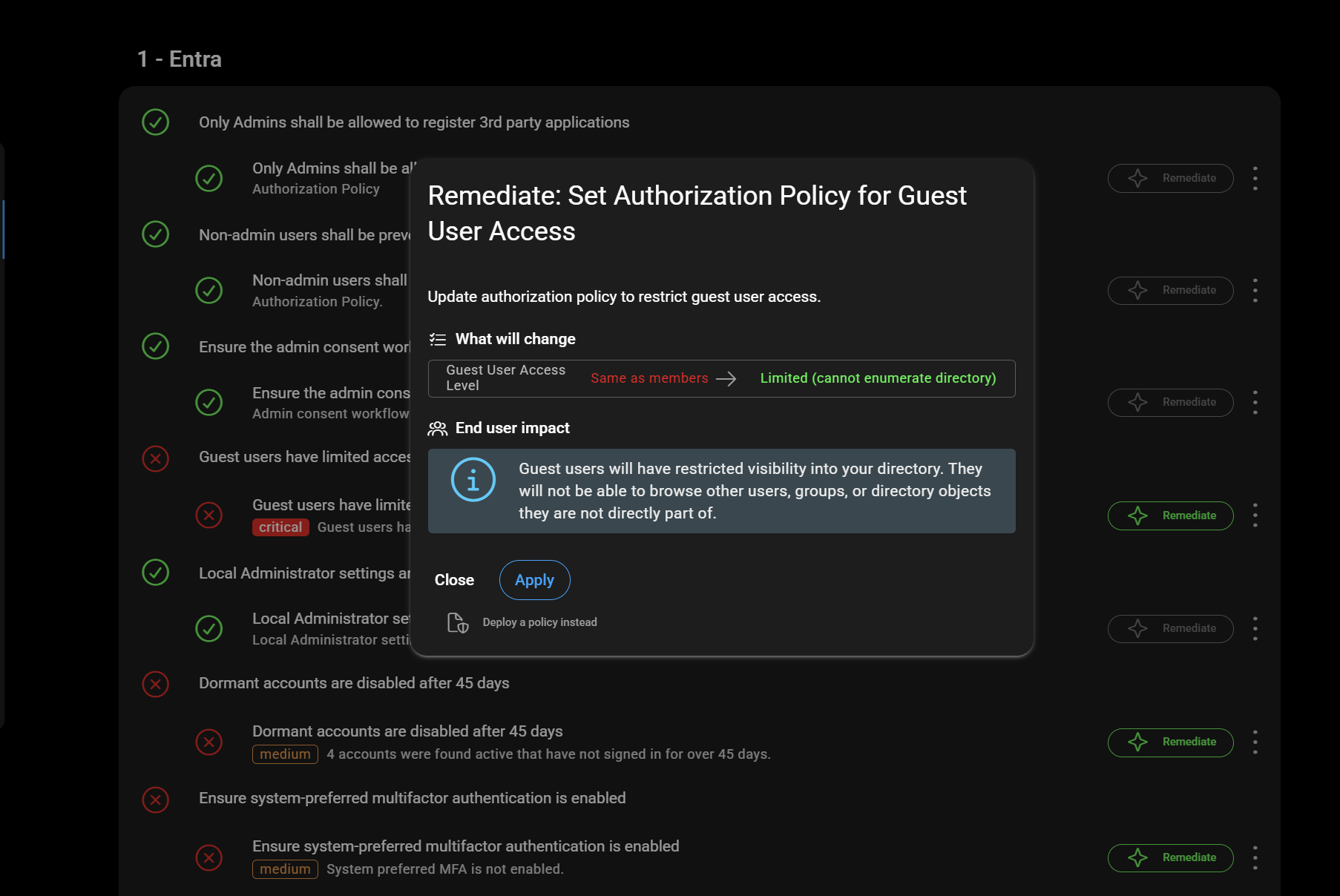 When you find a gap, fixing it manually means research, scripting, testing, and applying, tenant by tenant. For a single control, that could be an hour of work. Across a portfolio of clients, it becomes a permanent backlog. And at the end of it, you often can’t verify that every tenant received the same fix, applied the same way.