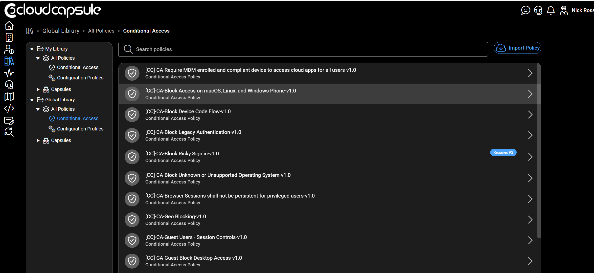 3 | Policy Library Your best work becomes your standard. If you’ve already done the hard work of dialing in a sophisticated configuration on a flagship tenant, a mature Conditional Access setup, a carefully hardened baseline, that work shouldn’t live in one place. The Policy Library lets you capture it. Import any policy directly from one of your downstream tenants, bring it into your library as a reusable template, and redeploy it to any tenant in your environment. Your best-configured client becomes the template for every other client. You’re not recreating your best work from memory every time you onboard a new client. You’re replicating it exactly. No golden tenant needed to pull in templates. |