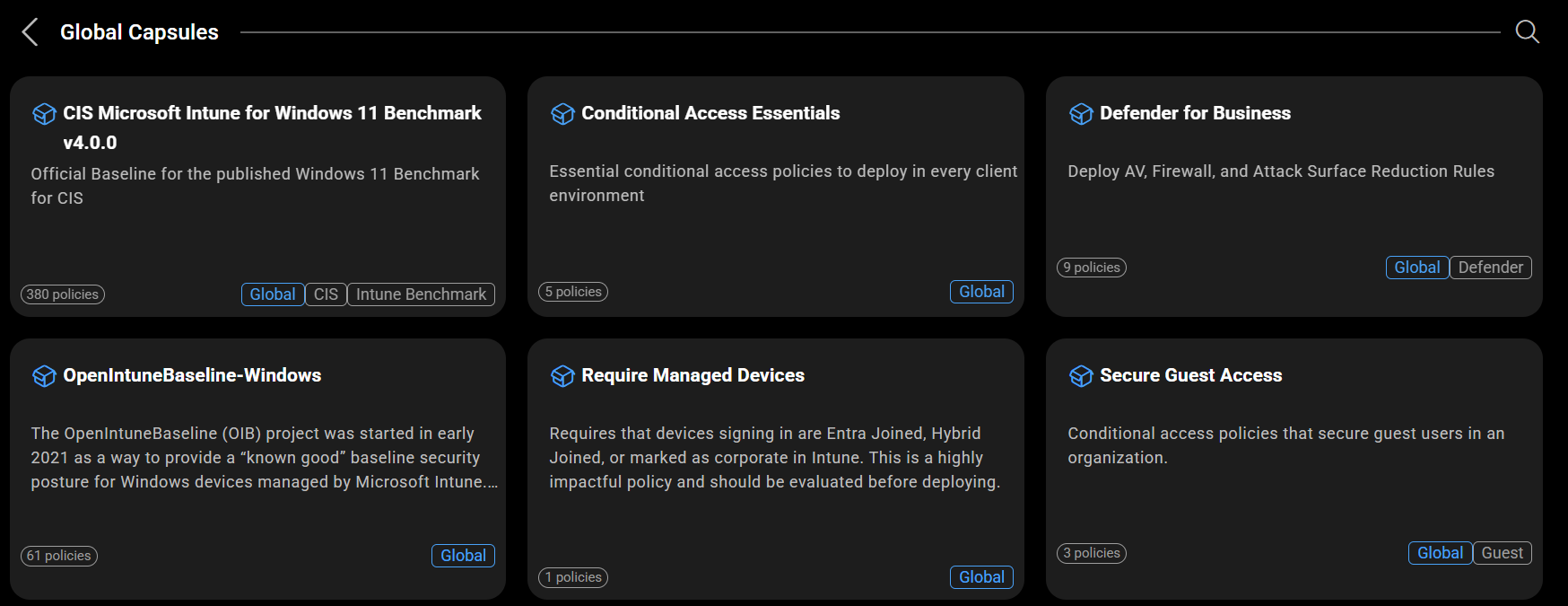 4 | Capsules Deploy to business outcomes, not just policy lists. Your clients don’t think in policies, they think in outcomes. “We need Defender for Business deployed.” “We need to hit CIS compliance.” “We need a security baseline in place before this new client goes live.” Capsules are built around those outcomes. A Capsule is a pre-bundled package of controls mapped to a specific business function or security baseline. CloudCapsule ships ready-to-go Capsules for things like Microsoft Defender for Business end-to-end deployment and the CIS Intune Benchmark. You can also build your own, bundle your MSP’s standard controls into a single deployable package and push it across your entire customer base. What makes Capsules genuinely different is multi-tenant deployment visibility. You get a live status grid: which clients have a Capsule fully deployed, which are partial, which are missing it entirely. All at once. No tenant-by-tenant login required. That grid changes a client conversation from “we’re working on it” to “here’s the status.” |