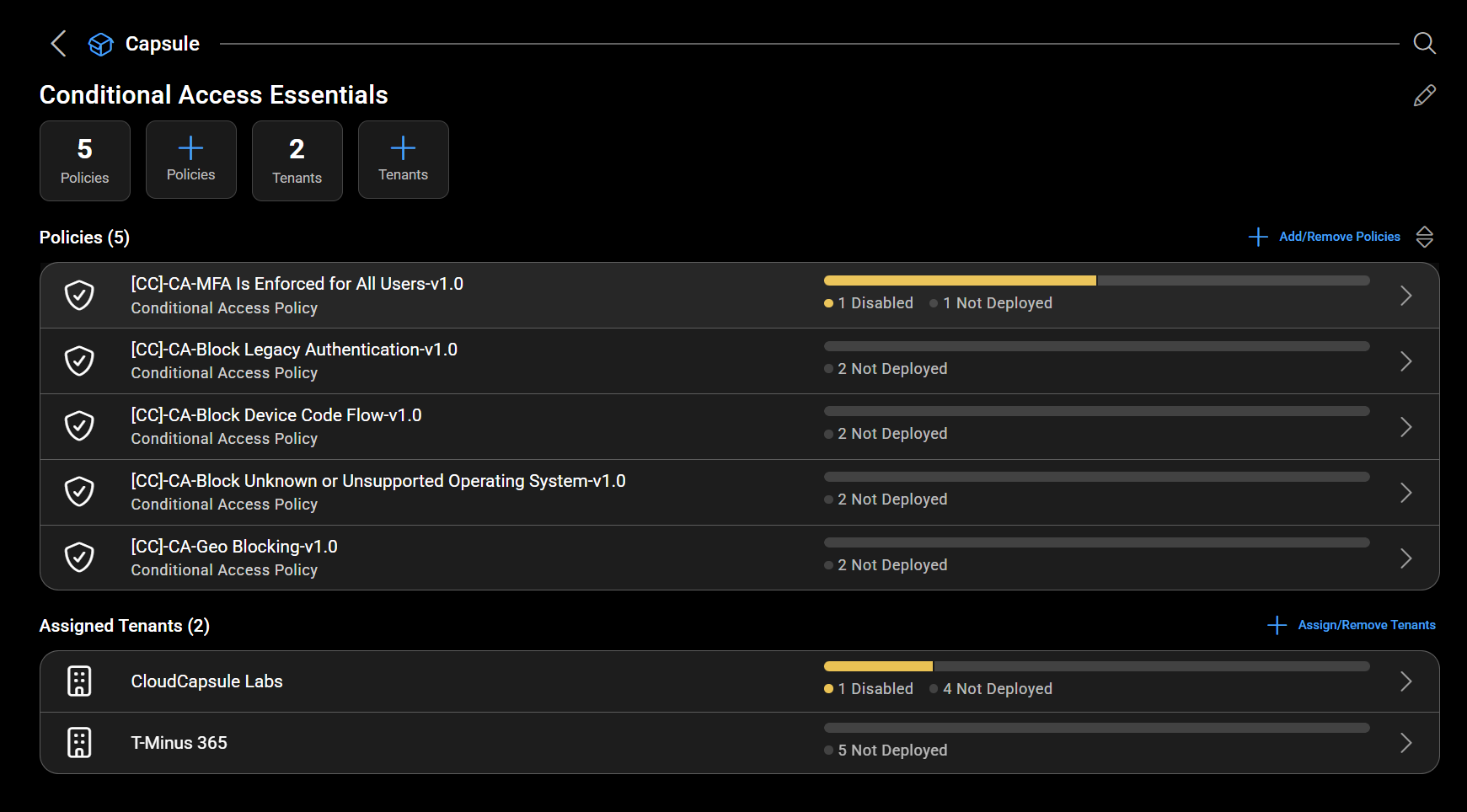 There’s a meaningful difference between “this policy exists” and “this policy is enforced across every tenant.” Most security tools report on the former. They can’t tell you whether the configuration you pushed three months ago is still in place, was partially overwritten, or was missed on a handful of tenants entirely. CloudCapsule closes that gap, Manage lets you act on what you find.