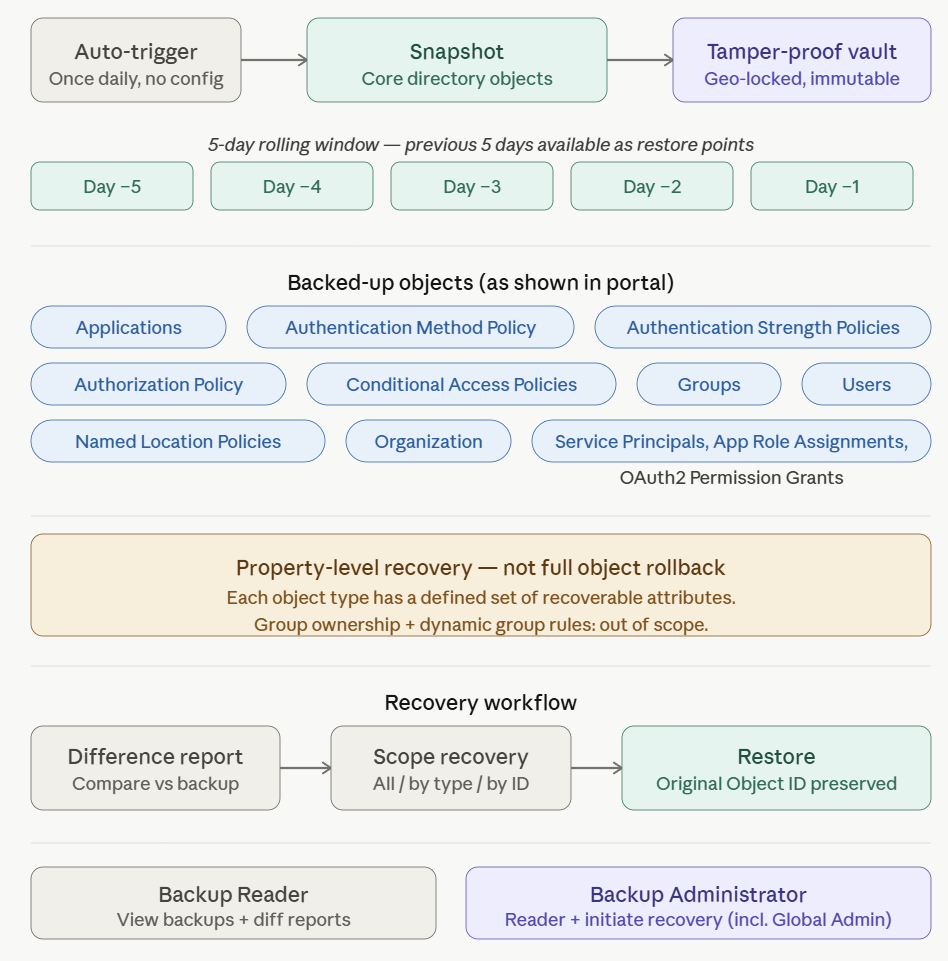 This is still preview. Behavior may change before GA. For the full technical reference, see the Entra Backup and Recovery documentation and the supported objects and properties reference.