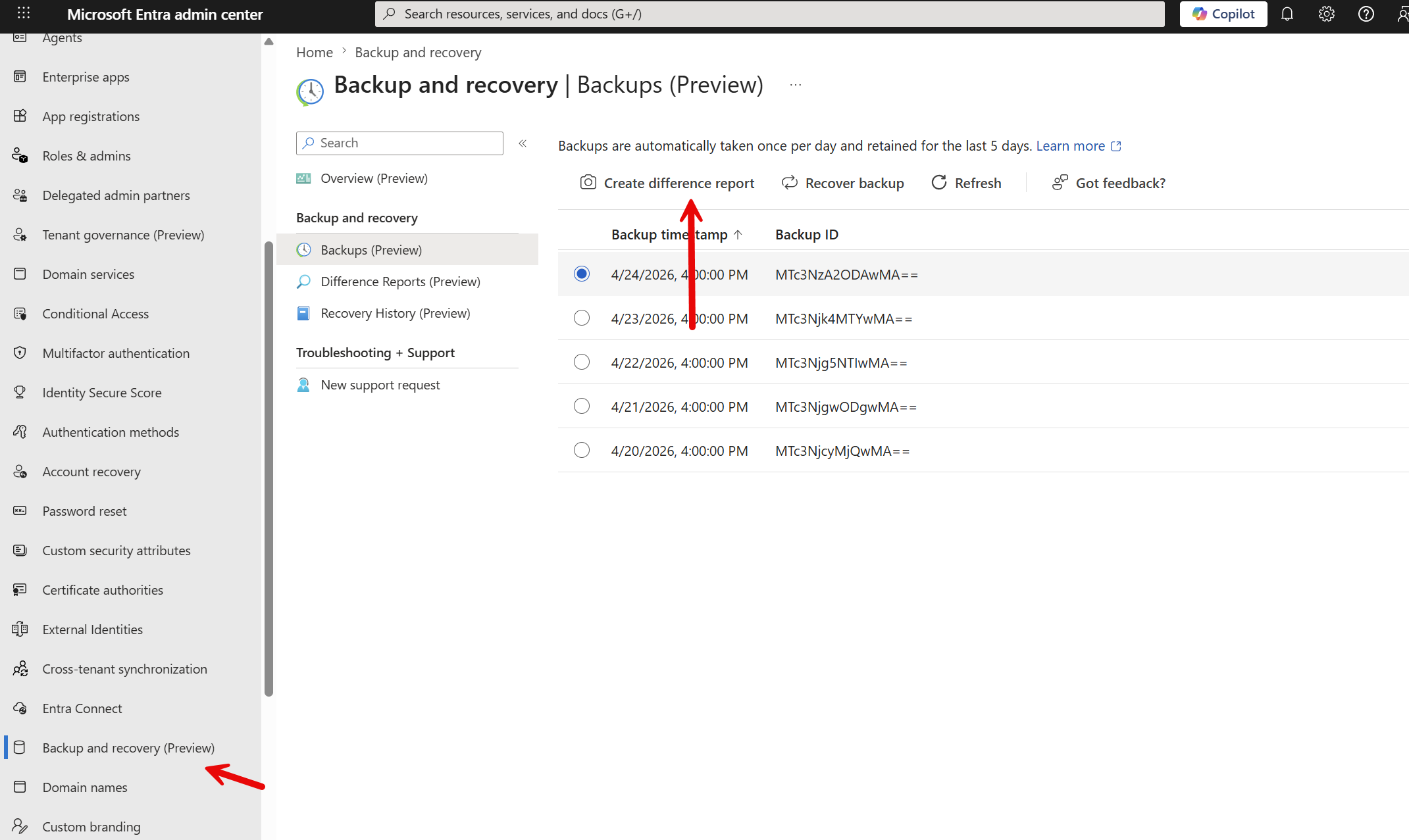 In the Entra admin center, navigate to Backup and recovery > Backups. You’ll see up to five restore points representing the previous five days. From you here can select one and create a difference report