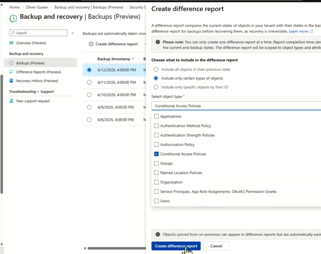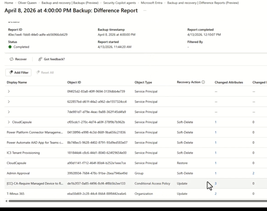 Preview caveat: difference report generation can take 25 minutes or more on larger tenants in preview. The first time you access a backup — whether through a report or recovery — the service loads that backup’s data, which takes fixed time regardless of tenant size. Subsequent operations on the same backup are faster. Run reports proactively in your environment so you know the wait time before you’re in a live incident.
