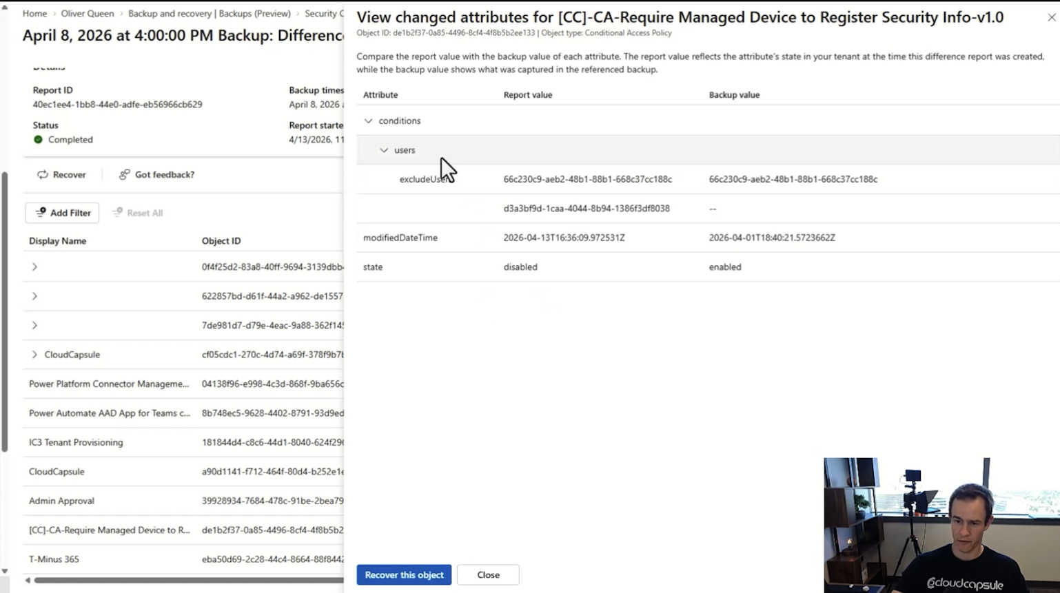 From here i could recover all items, all items by type (i.e groups, CA policies, etc.), or a specific object. Below, you can see an example of a conditional access policy that was disabled and had a new user added to the exclusions. I could recover this object and revert it back to what it was before this change: