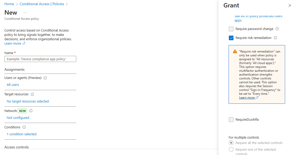 Microsoft recently introduced a new option called Require risk remediation. This feature consolidates several security actions into a single control: