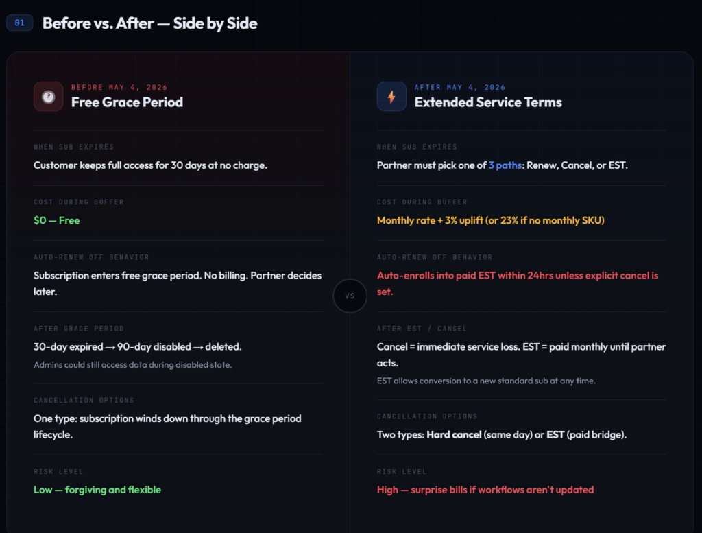 Microsoft announced the free grace period for accessing services on nonrenewed subscriptions will be discontinued. Customers and partners will have three clear choices after expiration: renew, cancel, or move to a paid EST to maintain service while next steps are decided.