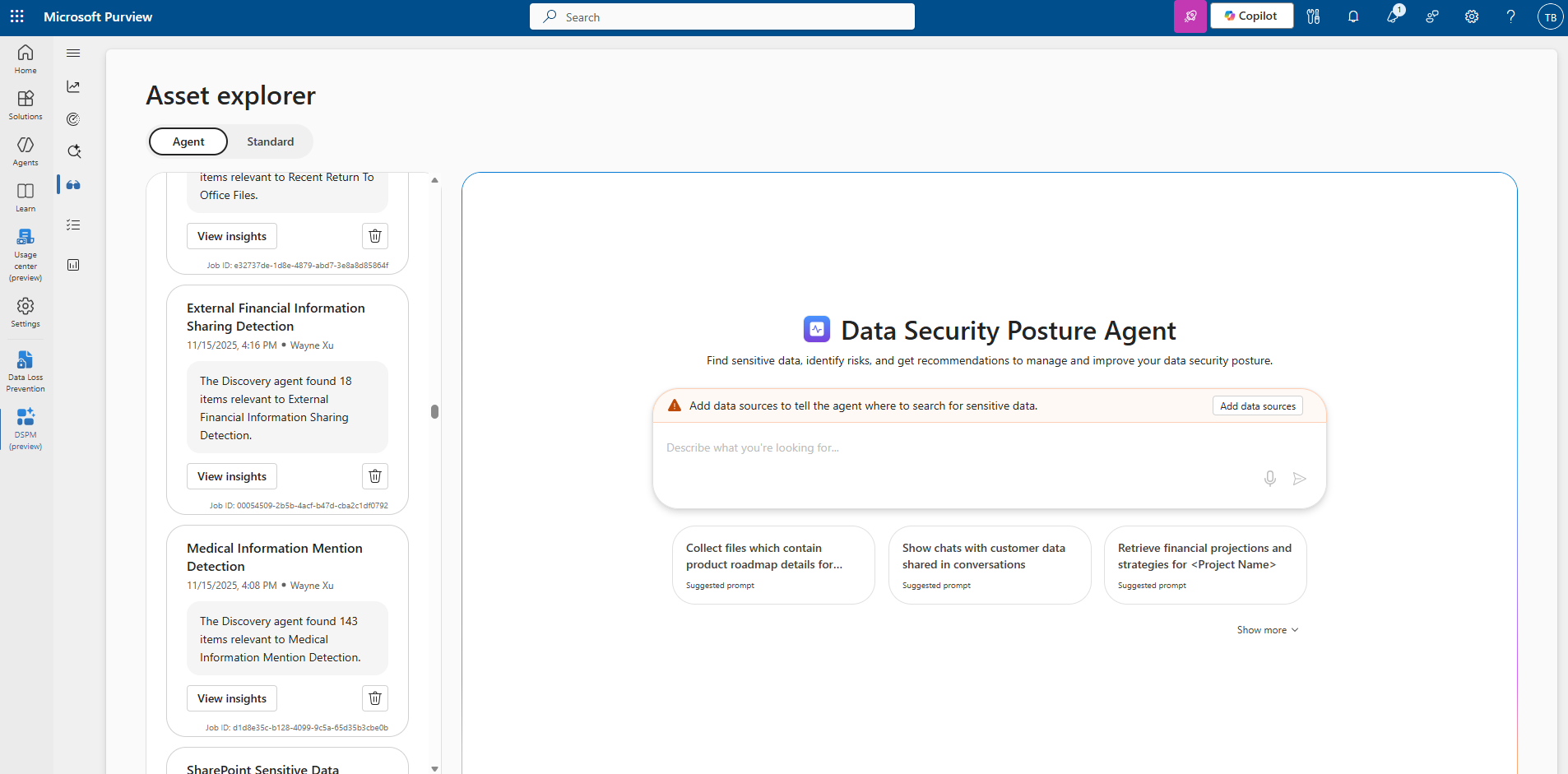 This agent helps data security admins proactively discover sensitive data across your organization’s data estate and assess associated risks. By leveraging large language models (LLMs), it goes beyond traditional keyword-based analysis to understand the purpose and context of content, enabling more accurate risk identification and actionable insights.