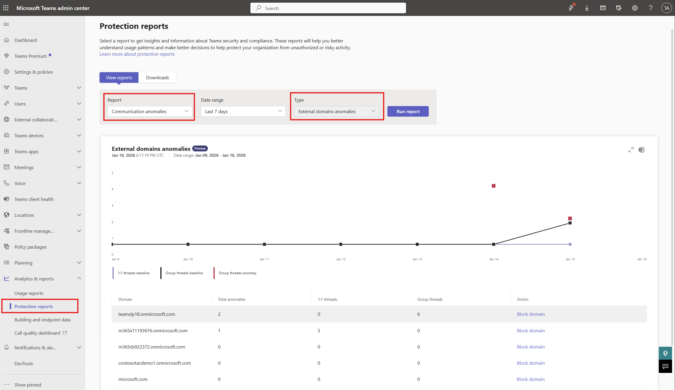 - A new External domains anomalies report will be available in the Microsoft Teams admin center under Protection reports.