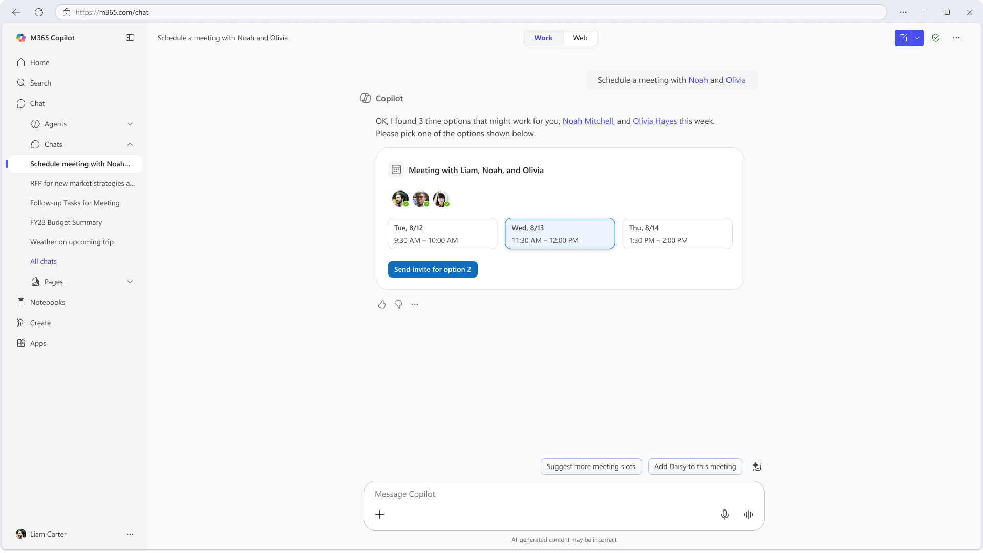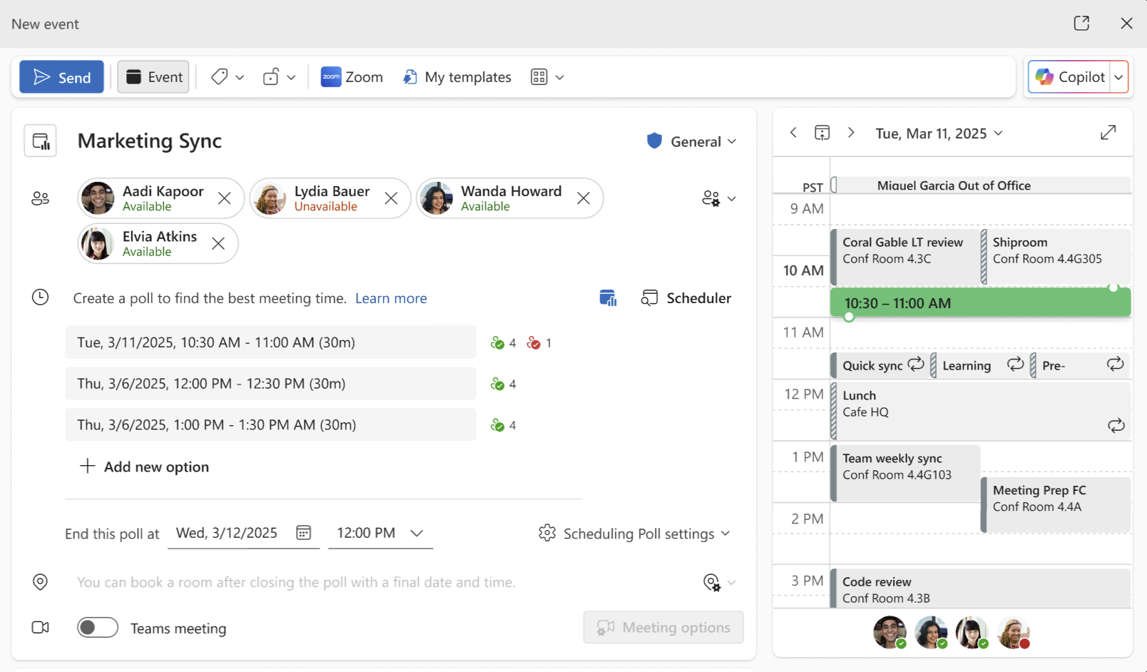 This enhancement reduces context switching by allowing users to find available times, book rooms, draft agendas, and send invites—all within the chat experience.