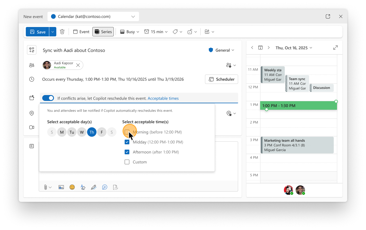 Copilot is making it easier to manage scheduling conflicts by automatically rescheduling 1:1 meetings and personal events. Within the meeting event form, users can indicate which events are more flexible and allow Copilot to reschedule them if conflicts arise. Users can also set preferences for when rescheduled events should occur. Copilot will detect double-bookings and automatically move these flexible events to a better time—saving users time and reducing manual coordination.