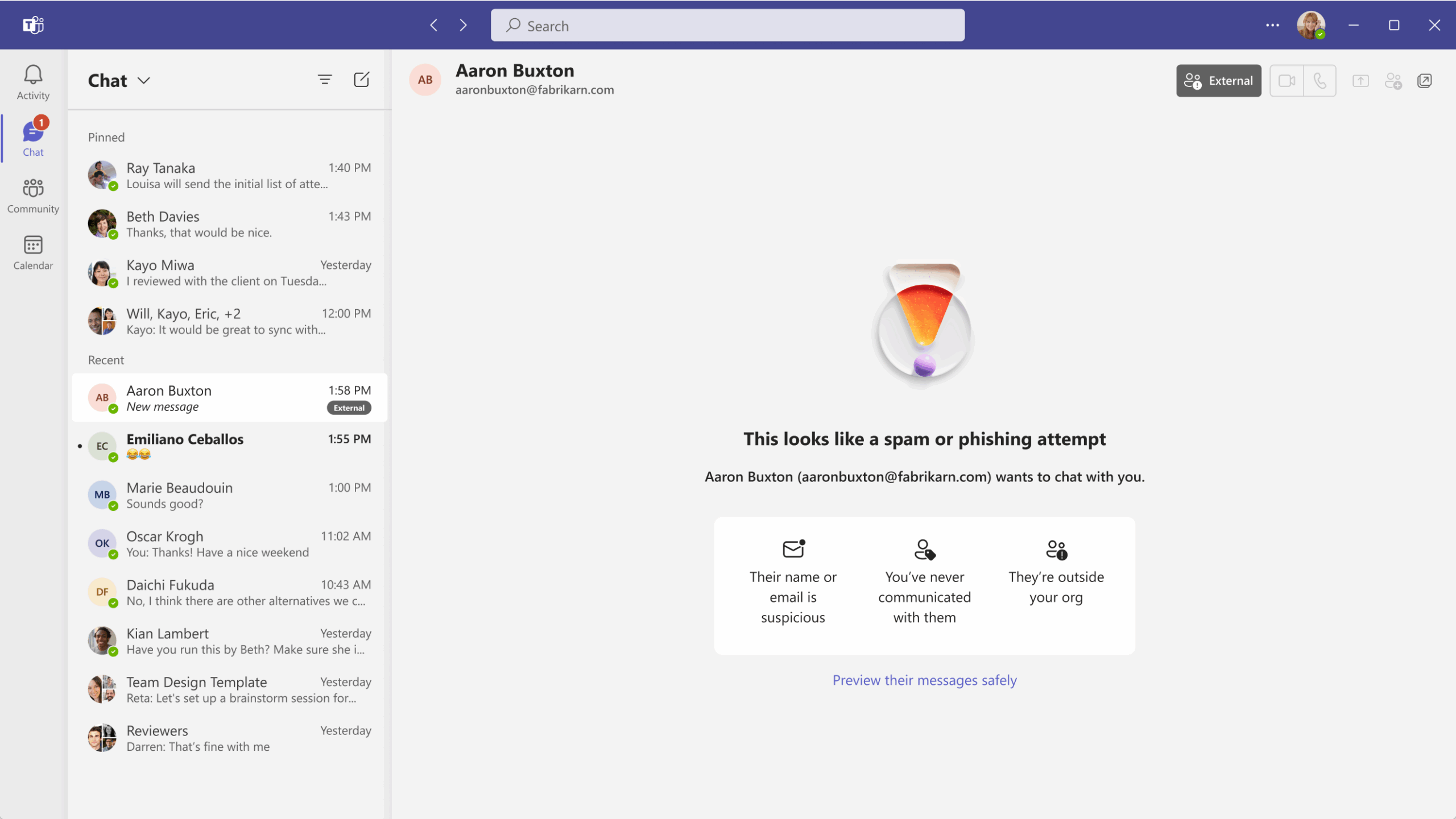 If your organization allows external domains to contact users in Teams, we will identify if an external user is impersonating a domain owned by your tenant during their initial contact through Teams chat. If we detect potential impersonation, we will show a high-risk alert to the user, notifying them to check for suspicious name/email and proceed with caution.