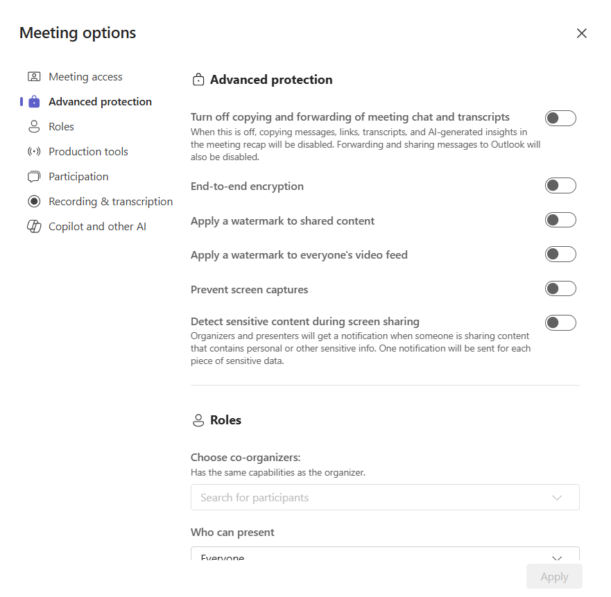 Helps protect sensitive meeting content by blocking screenshots and recordings across supported platforms. When enabled by the meeting organizer, this feature restricts screen capture using native device tools and most third-party apps.